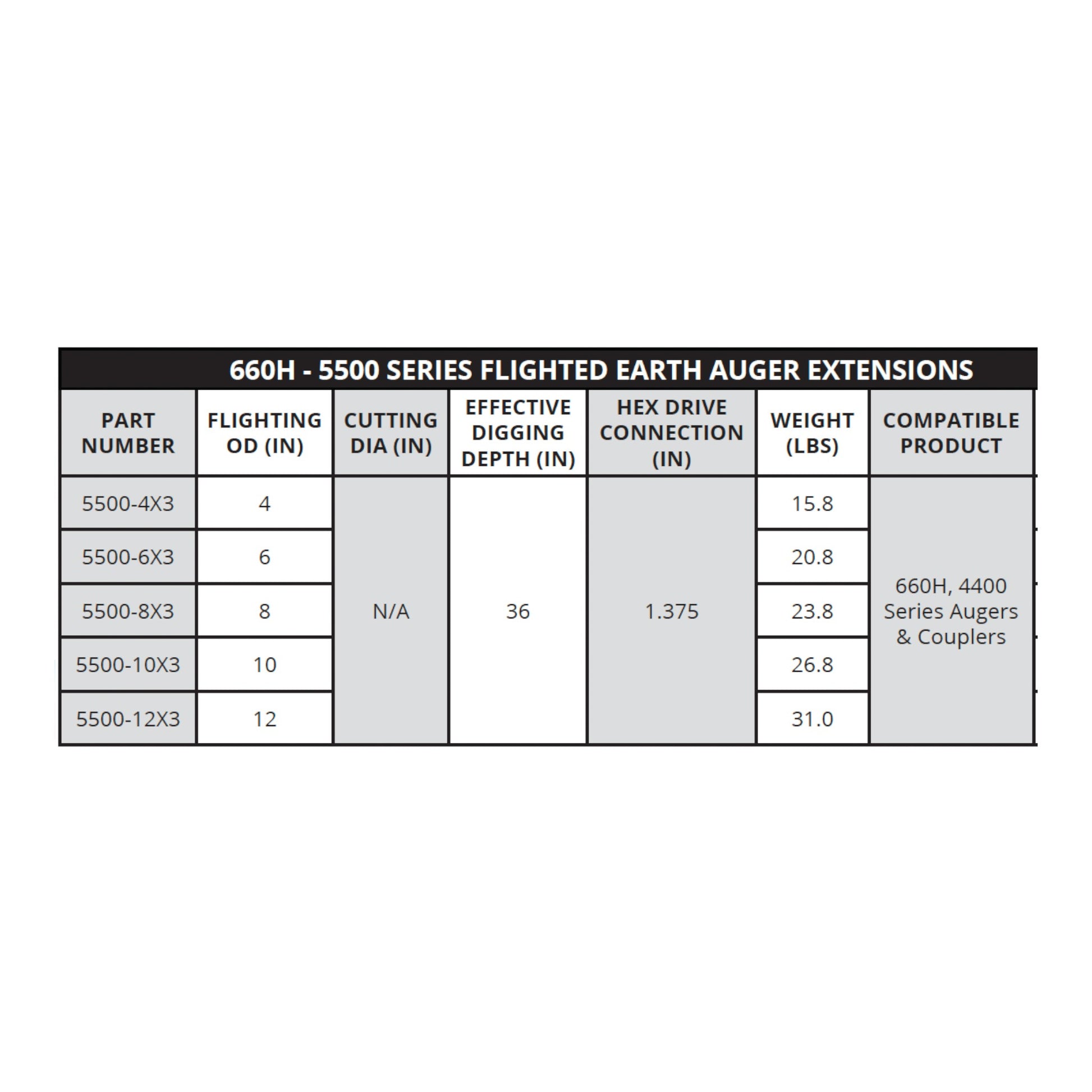 The 5500 Series Flighted Earth Auger Extensions are your go-to solution for digging deeper without compromising performance or power. Built with the same rugged design as the 4400 Series augers, these extensions easily attach between your auger and powerhead to give you an additional 36 inches of effective digging depth. Whether you're punching through hard-packed soil or going deeper for fence posts, signposts, or foundation footings, this extension lifts more dirt out of the hole and keeps you digging with confidence.
