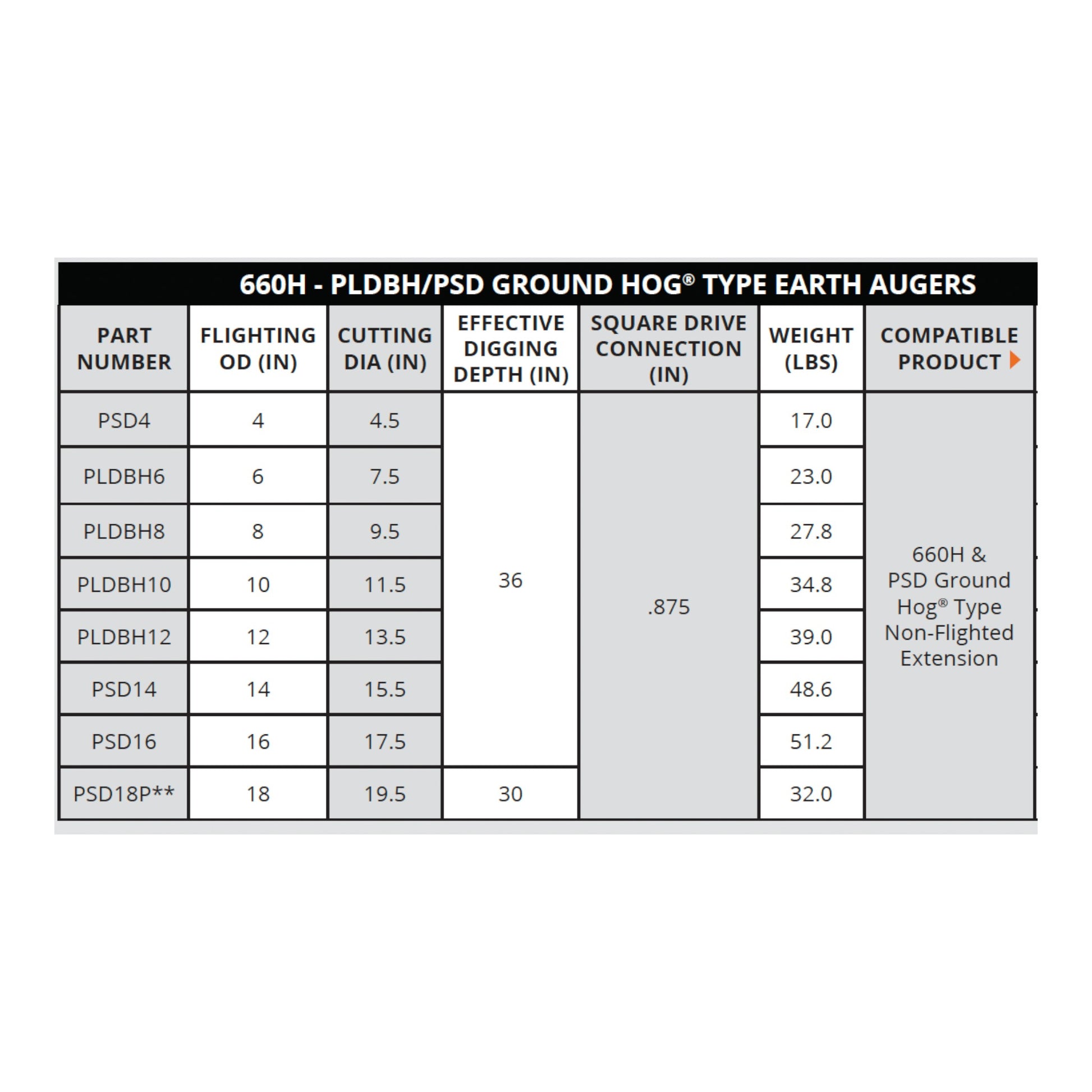 The PLDBH/PSD Ground Hog Type Earth Augers bring you the heavy-duty construction of the 4400 Series, now compatible with your Ground Hog hole digging equipment. Built tough with a specialized .875 inch square auger drive connection, these augers are ready for serious digging tasks. Whether you're on a farm, jobsite, or rental fleet, you’ll get deep, clean holes with less effort and more reliability. Match your auger to the job with multiple diameters and cutting tooth options tailored to different soil conditions.