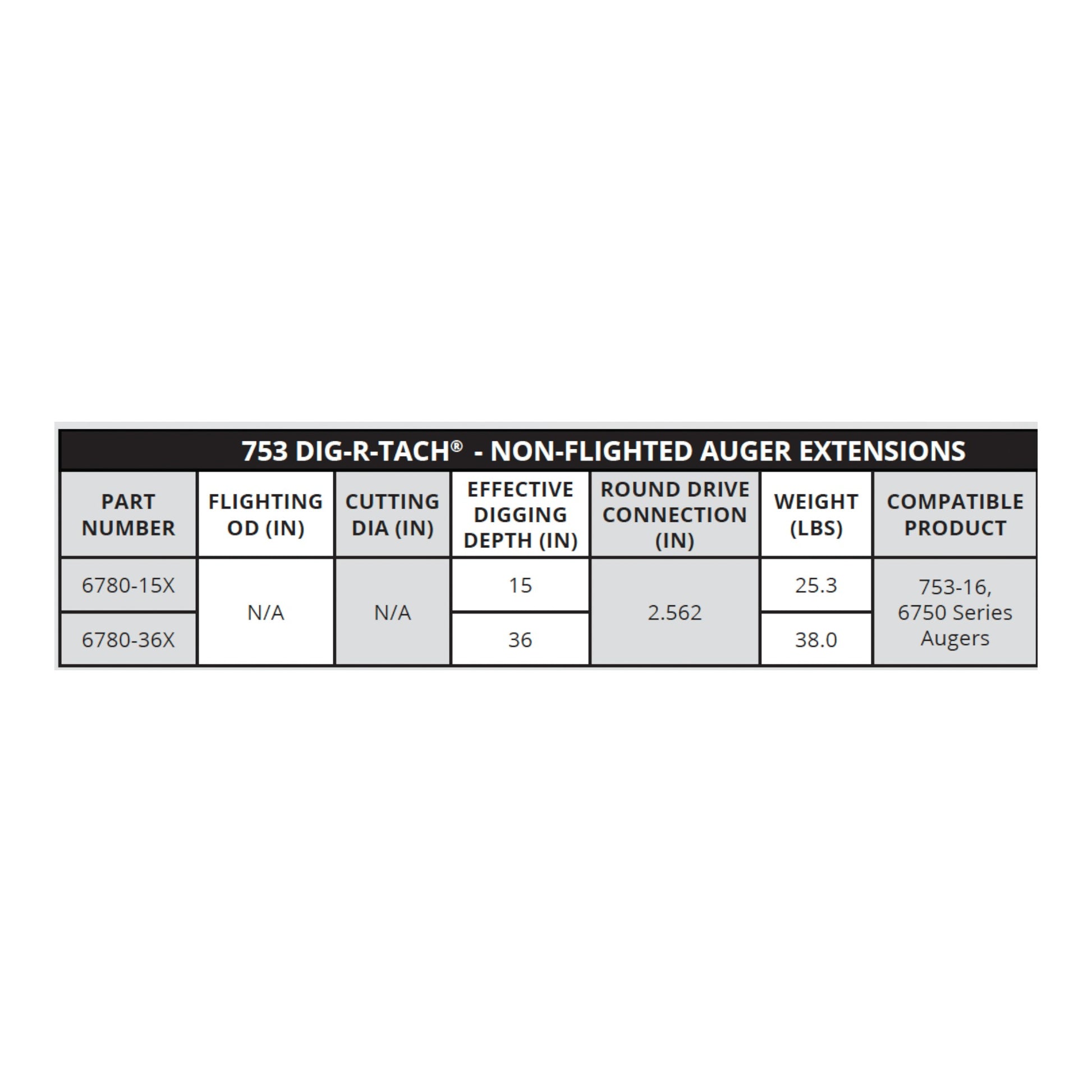 The 753 DIG-R-TACH Non-Flighted Auger Extensions are made for round-connection pros who want to dig deeper without sacrificing strength, performance, or that satisfying sense of dirt-kicking victory. With the same rugged construction as the 6700 Series, these extensions are built to take on serious digging with larger augers and tougher soils. Whether you’re going deep for utility work or just adding some reach to your setup, these extensions keep your operation smooth, strong, and smiling. Available in multiple lengths to suit your needs and keep your day moving forward.